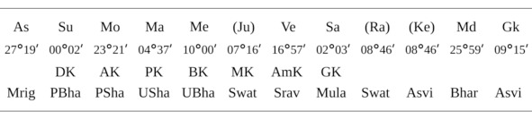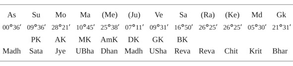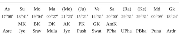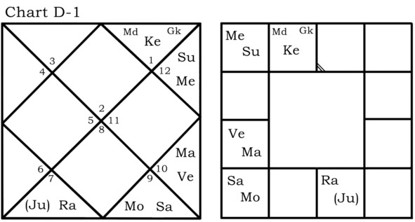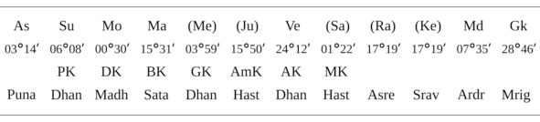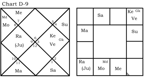 In this book, I will use Navamsa sparingly, doing so intentionally to highlight the importance of the division chart D-6, often overlooked in traditional analyses. Navamsa is a powerful predictive tool, where planetary positions, Yogas, nakshatras, and other key points are interpreted alongside the Rasi chart. For similar reasons, I will not focus on Chara Dasha analysis; instead, I will concentrate on Vimshottari Dasha. A deeper knowledge of this Dasha system will help you be confident in 90% of your judgments, with only a few birth charts requiring verification by other methods.