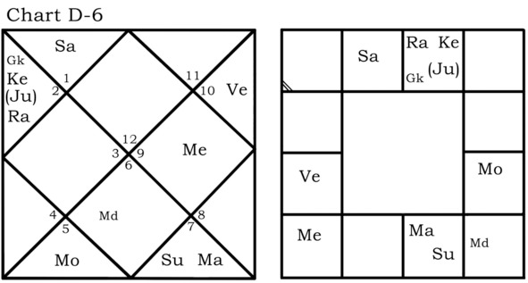 An affliction of Jupiter in the D-9 chart may relate to matters of marriage, or they may concern health, but its role in the D-6 will be decisive.