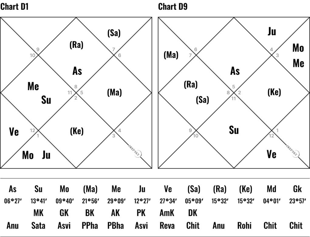 В гороскопе Д—1 (основная натальная карта), в гороскопах Д—9 (дополнительный гороскоп к основной карте) и Д—4 (карта территории) Венера занимает особое положение. Венера формирует во всех трех гороскопах королевскую комбинацию Раджа Йоги и во всех трех картах Венера связана с одиннадцатым домом союзов и объединений.