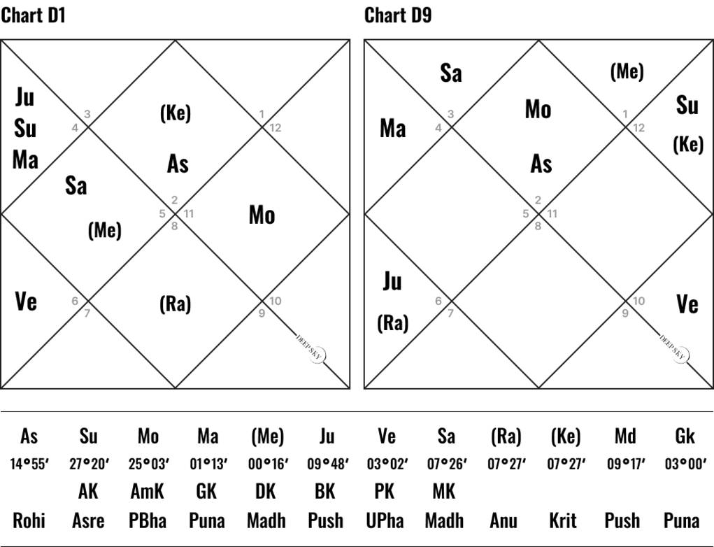 Вишакха связана с санкциями, ее хозяин Юпитер в данном гороскопе управляет шестым домом санкций и судебных процессов, а также девятым домом дипломатии и юриспруденции. Из – за показателей обоих этих домов Меркурий ослабляется.