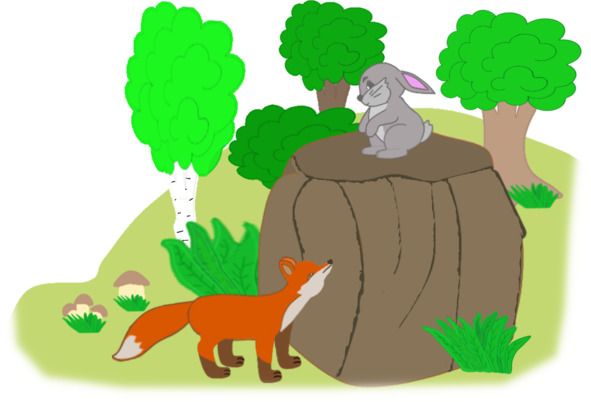 Вдруг видит ослик: на большом камне маленький зайчонок сидит, а вокруг камня лиса кружит. Так и хочет зайчонка поймать.