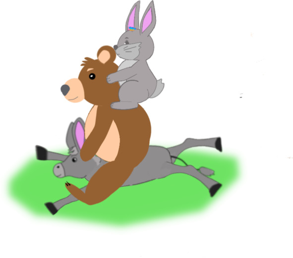 Пошел ослик с косолапым и зайчиком дальше. Ослик косолапого везет, а зайчонок на косолапом сидит.