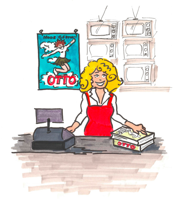 Договорившись о бесплатной аренде одного квадратного метра стола в отделе продажи телевизоров и оргтехники, мы в эстетической композиции разложили три каталога: два толстых Квелле и один Мадлен, и прикрепили скотчем на стену плакат с белозубо улыбающейся фрау: «Хочется чего-то нового – покупайте в Квелле, не вставая с дивана!»