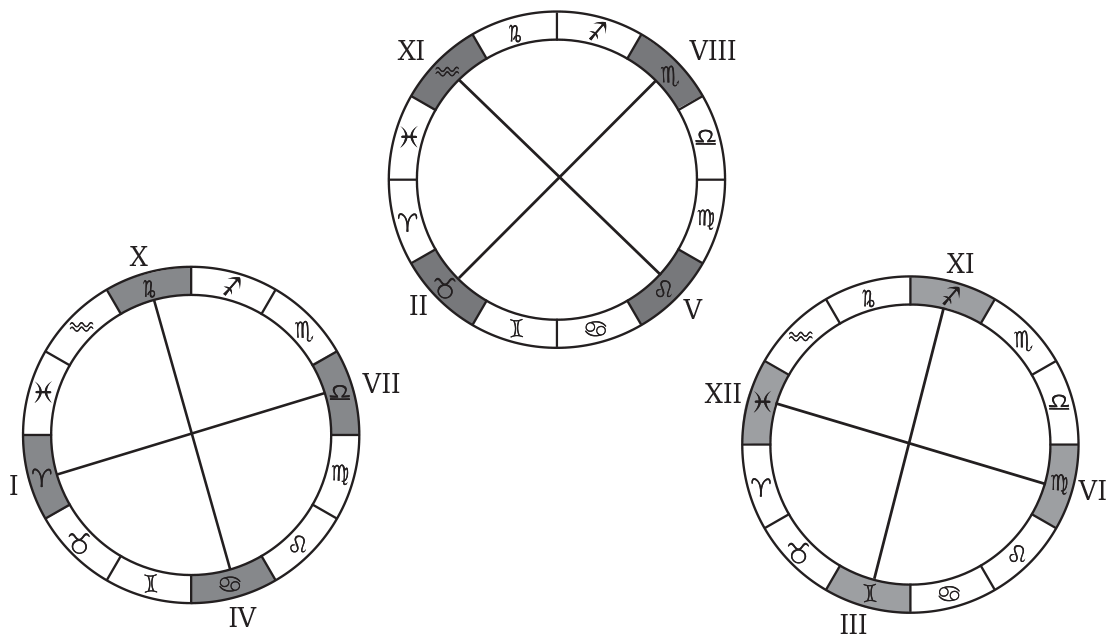Деление домов по крестамРазделяя знаки зодиака по стихиям, мы получили 4 группы по 3 знака, эти 3 знака отличаются друг от друга и соотносятся с тремя разными крестами. Таким образом, каждому кресту соответствуют 4 знака зодиака, и они обладают схожими свойствами. Аналогичный подход применяется и при классификации домов гороскопа. Мы имеем разделение на 4 стихии, о чем говорилось выше, и 3 креста.