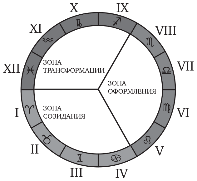 Эти дома символизируют первый импульс в любом начинании. Здесь сосредоточены базовые условия для дальнейшего развития. Стихии представлены в своем ярчайшем проявлении, в этих домах присутствует инициатива, чаще всего спонтанная и бесцеремонная. Зона созидания символизирует детство и юность.