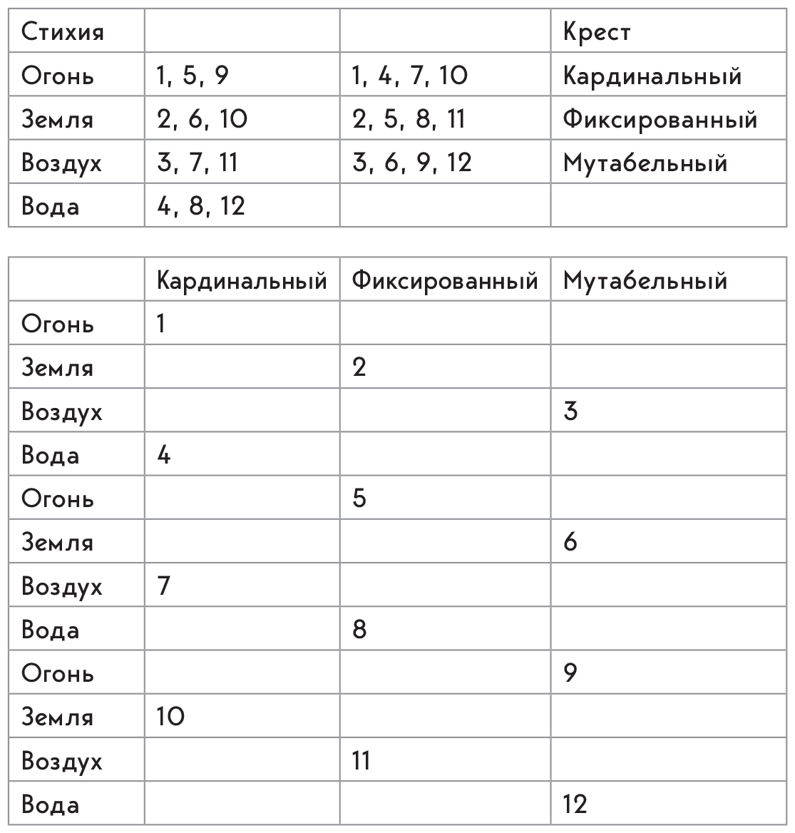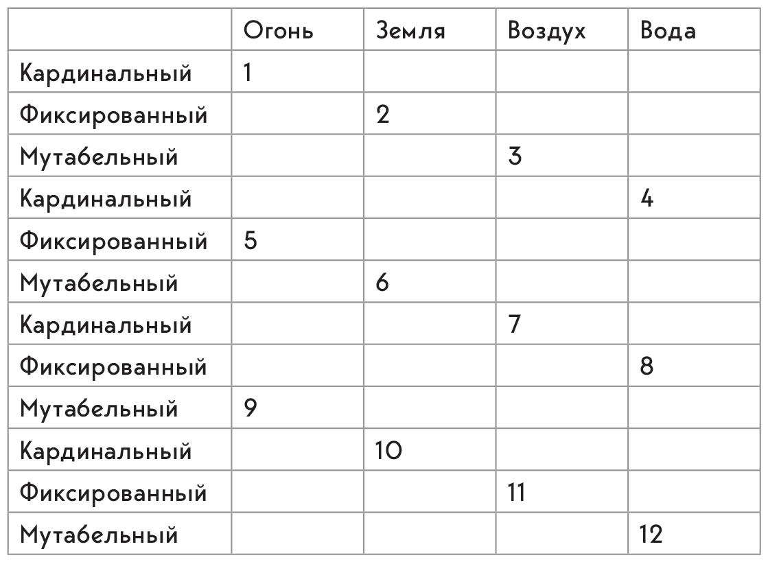 Таблица 1. Стихии и кресты 12 домов гороскопа