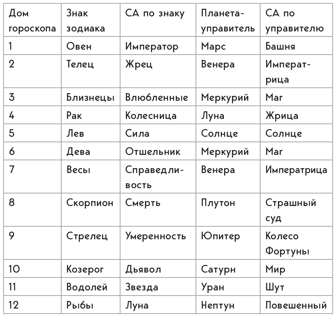 В классической колоде Таро содержится 78 карт, из них 22 карты старших арканов (СА) и 56 младших арканов (МА). Каждый старший аркан соотносится с одним из 12 знаков зодиака или одной из 10 планет. Каждый знак зодиака имеет планету-управителя, или, наоборот, каждая планета имеет знак зодиака, являющийся для нее обителью, в котором планета максимально естественно и неискаженно проявляет свои качества. Таким образом, через астрологические соответствия для каждого старшего аркана мы можем обнаружить подходящий для него дом по знаку зодиака или планете-управителю. Так как планет меньше, чем знаков зодиака, то иногда они будут повторяться.