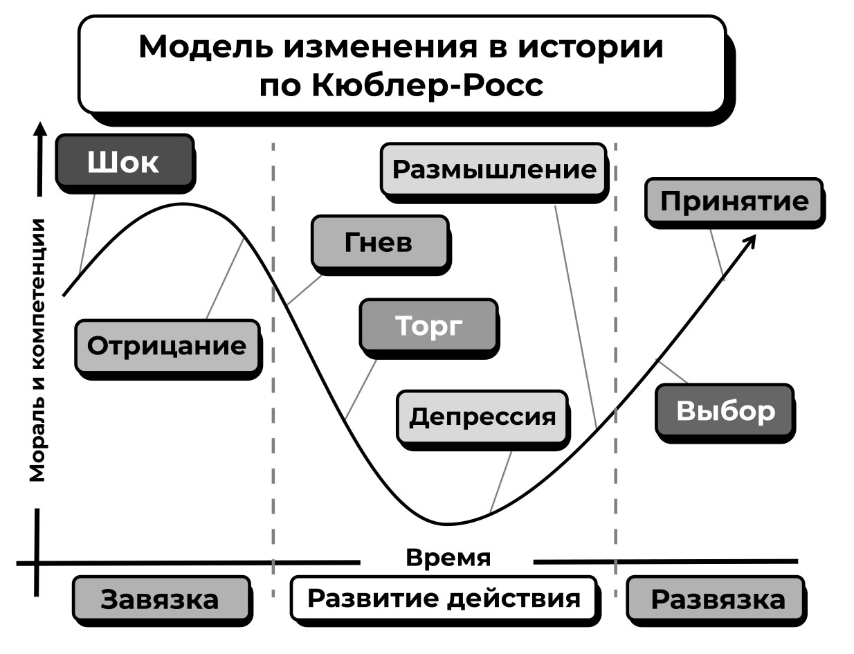 Модель изменения Кюблер-Росс похожа на кривую принятия. Смысл схемы тот же, но изложение немного иное за счет присутствия шкалы времени, которую я взяла из ритуала про похороны. С первого по третий день похорон близкие умершего испытывают шок и потрясение. Они в ступоре, ничего не чувствуют, мало что соображают. Многие хотя бы плачут – и это уже хорошо.