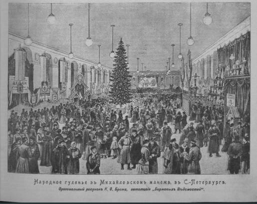 Санкт-Петербургское Городское Попечительство о народной трезвости традиционно устраивало гулянья, спектакли и беспроигрышные лотереи в Михайловском манеже (Манежная пл., 6). 31 декабря вечером шла малороссийская комическая опера И.П. Котляревского «Москаль-Чаривнык» («Москаль-чародей»), написанная ещё в 1819 г., и по-прежнему пользовавшаяся популярностью у публики, и «Арлекинада» – «волшебная пантомима в пяти картинах с танцами и превращениями». Гостей Михайловского манежа радовала роскошно украшенная электрическая ёлка и дешёвый буфет. Входная плата составляла всего 32 копейки.