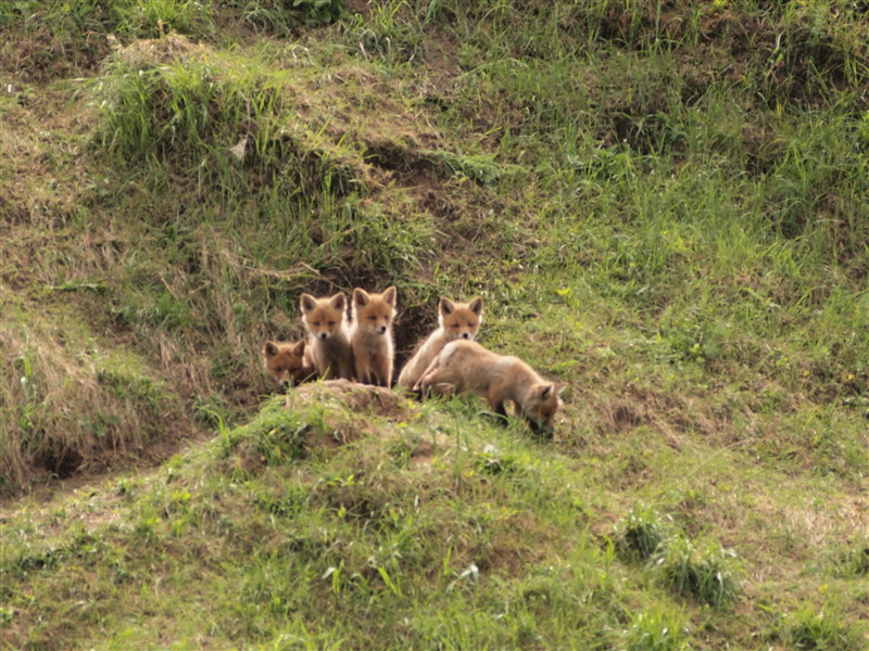 Беспечные и неопытные, они отвлеклись на что-то в траве и дружно сунули туда любопытные носы. Им явно хотелось играть. Потом самый смелый отбежал на пару метров от остальных и уселся столбиком, позируя для фото. Наверняка мамы-лисы дома не было, а то натрепала бы рыжая им уши, объяснила бы несмышлёнышам, что встречи с людьми могут быть опасны, поэтому лучше не высовываться. Осторожность и благоразумие – вот главные правила для лисят.