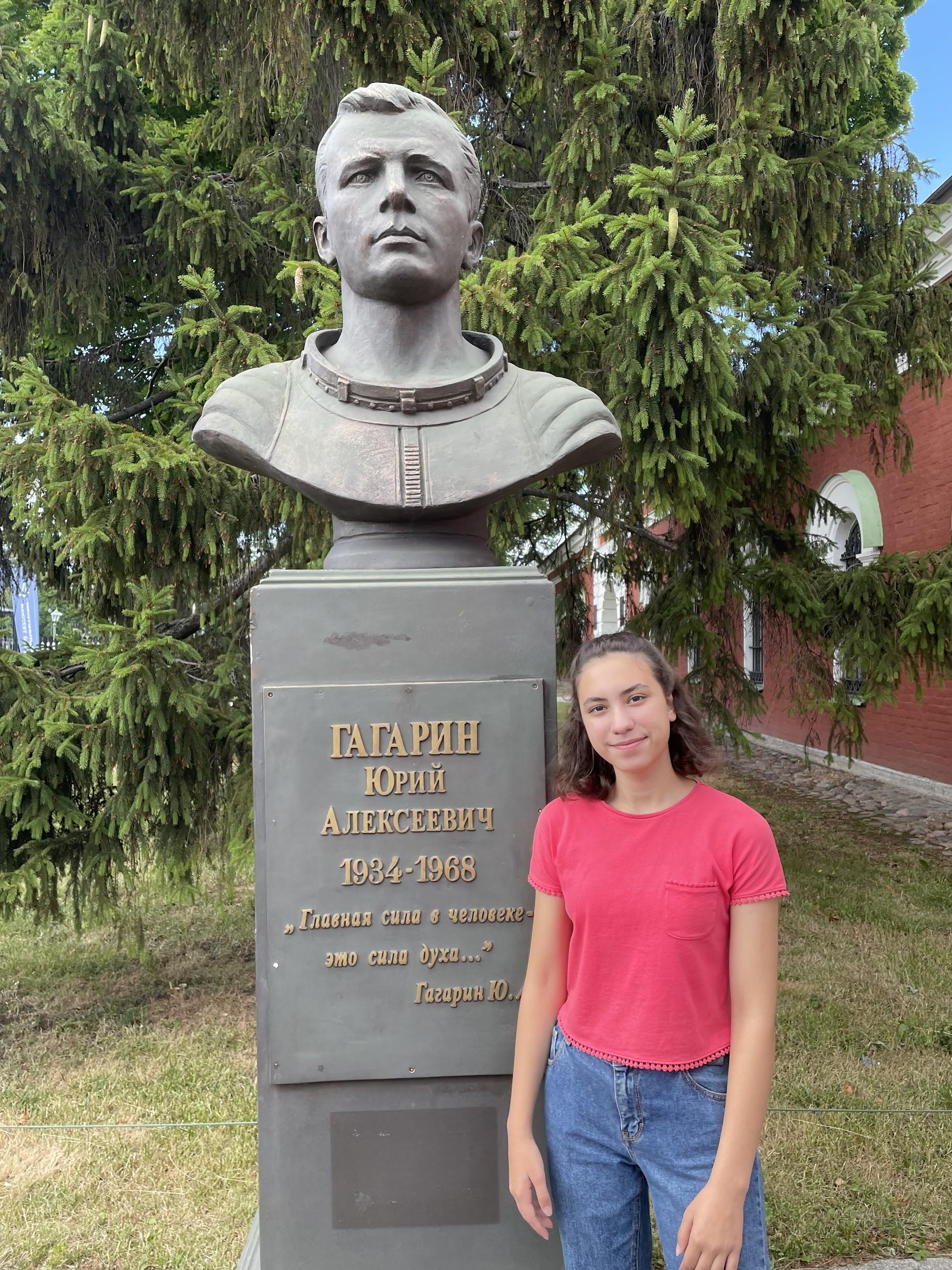 La photographie ci-dessous illustre le buste de Youri Alekseïevitch Gagarine et moi à côté de lui, à l'entrée du musée de l'astronautique à la forteresse Pierre-et-Paul (Saint-Pétersbourg, Russie)