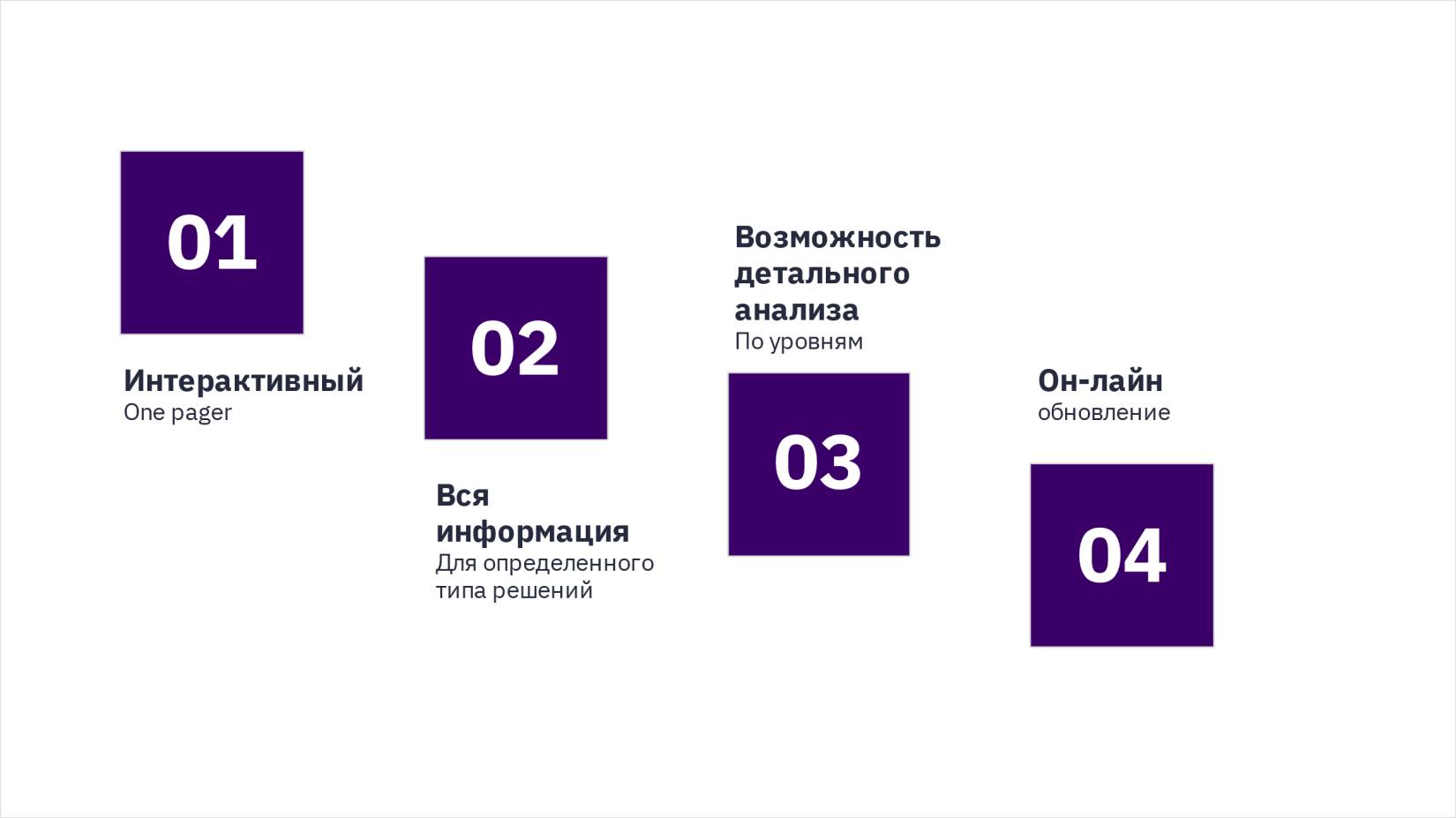 Здесь мы напишем название слайда, чтобы всем сразу стало понятно, какие решения можно принять с его помощью, а также расположим четыре-пять ключевых показателей, которые дадут понять, как себя «чувствует» объект нашего анализа.