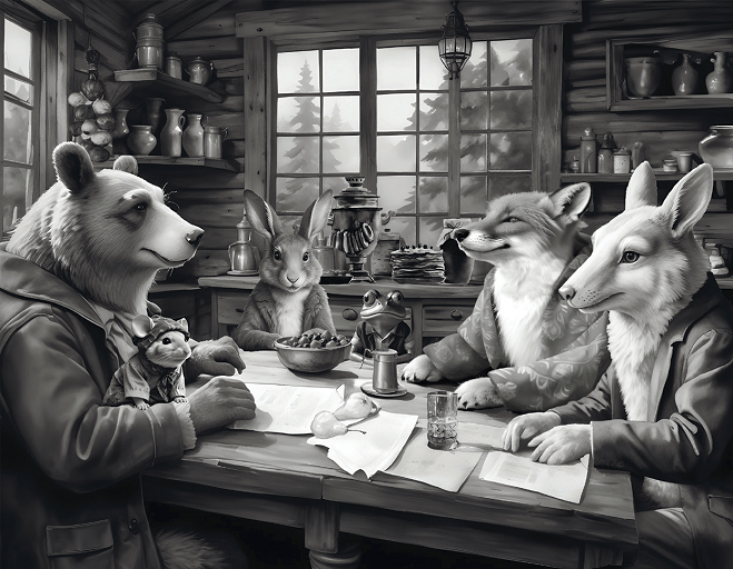 – Тук и тук, ворота открывайИ меня, детвора, принимай.Очень долго по полюшку шёл,Наконец-то я Терем нашёл.И пустите к себе вы меня,Пригожусь для чего-нибудь я.Пусть живёт в Теремочке и Волк.Будет нам и от Серого толк.Поселились они впятером,Всё решается в доме добром.Мышка день-деньской у печиВсё печёт пироги, калачи,А Лягушка то ткёт, то прядёт,Зайка ловко корзинки плетёт,Ну а Волк во дворе уж с утраПилит на зиму, рубит дрова.А Лиса у окошка сидит,Думу думает всё и молчит.* * *Но однажды сказала Лиса:– Я займу всего полчаса.И хочу я, друзья, вам сказать,В новый путь вас с собою позвать,Излечить и от бед, и от ран.Открываем мы здесь ресторан!Каждый делом займётся своим,С нашей дружбой мы всё победим!Волк курьером быть может у нас,