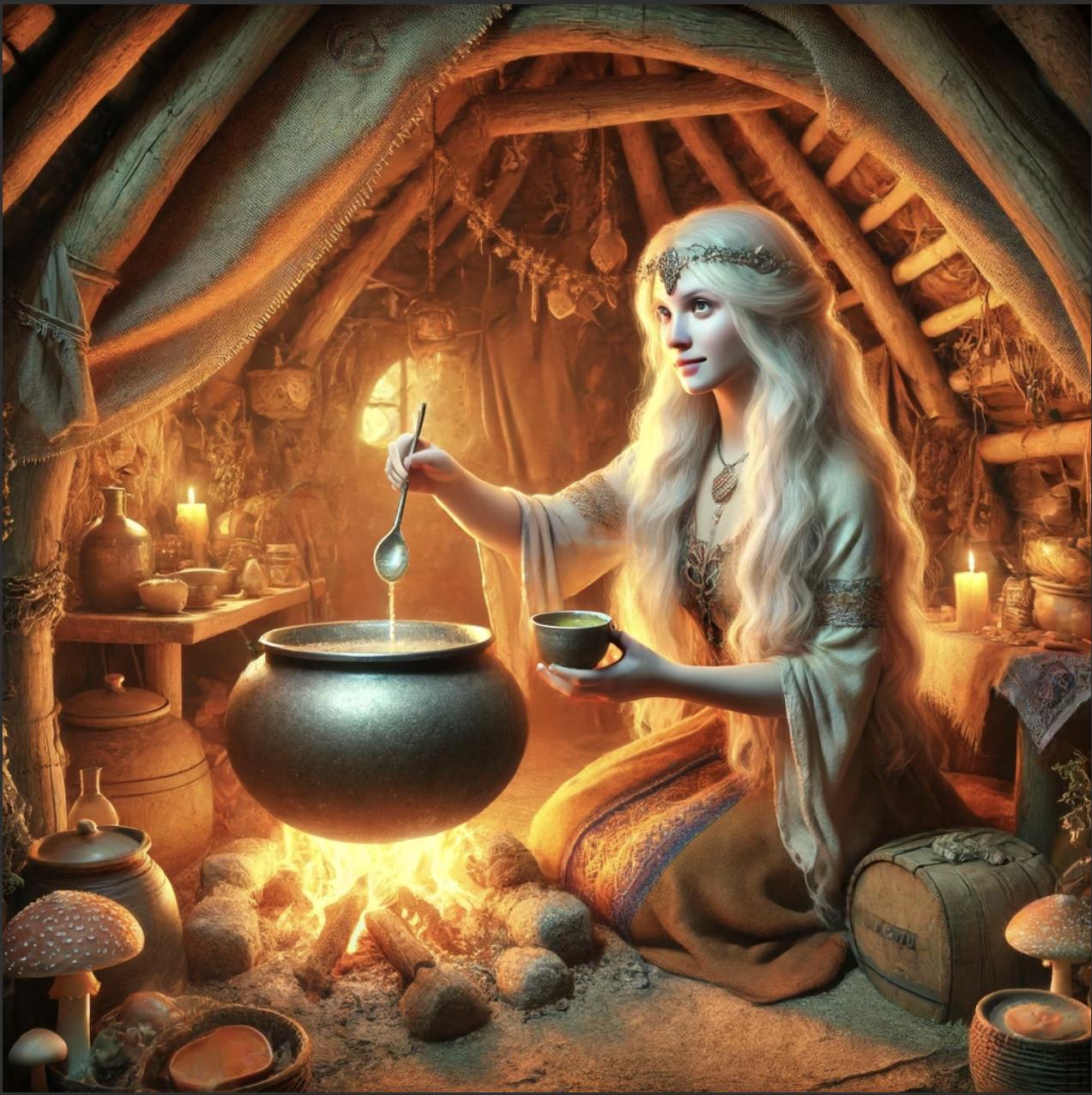 бабка стоит у огрооомного казана и зелье варит: то травку кинет, то