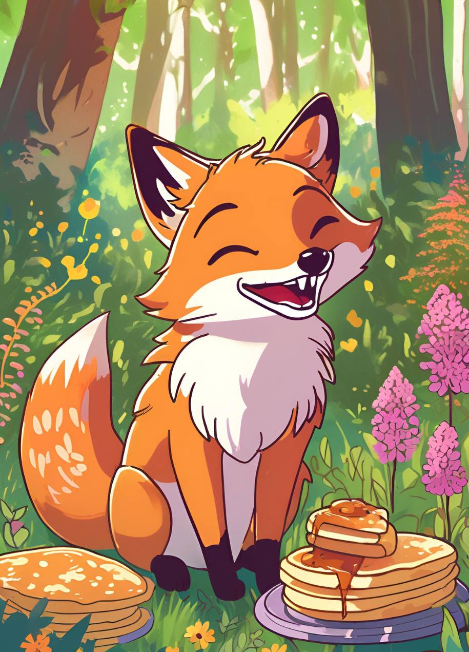 В тот же миг на кустарнике повисли пухлые оладьи. Ну и обрадовалась Лисичка! Наелась досыта, сорвала последнюю оладью и пошла довольная по лесу гулять. Идёт, отщипывает маленькие кусочки и в рот бросает, словно семечки.