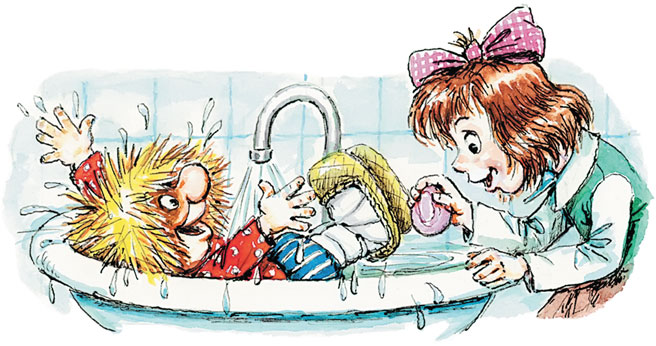 – Ну-ка, – сказала девочка, – полюбуйся на себя! – И протёрла зеркало, висевшее над раковиной.