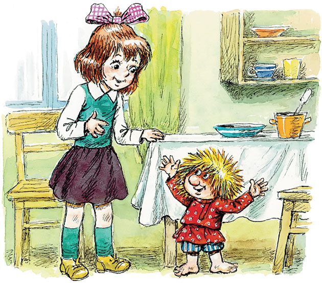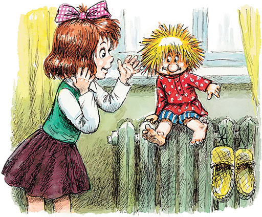 Девочка взяла веник, да так и села на пол, до того испугалась. Под веником кто-то был! Небольшой, лохматый, в красной рубахе, блестит глазами и молчит. Девочка тоже молчит и думает: «Может, это ёжик? А почему он одет и обут, как мальчик? Может, ёжик игрушечный? Завели его ключом и ушли. Но ведь заводные игрушки не умеют кашлять и так громко чихать».