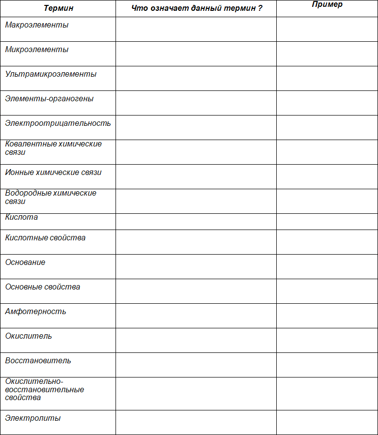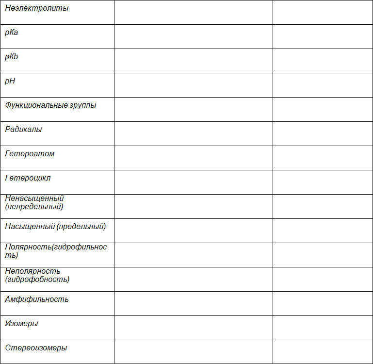 ЗАДАНИЕ 1Дайте определения нижеследующим важнейшим понятиям из общей и биоорганической химии, приведите соответствующие примеры, заполнив таблицу: