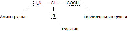 Аминокислоты – это органические карбоновые кислоты, у которых, один атом водорода замещен на аминогруппу. Таким образом, аминокислоты содержат карбоксильную группу (-СООН), аминогруппу (-NH2), асимметричный атом углерода и боковую цепь (радикал – R). Именно строением боковой цепи аминокислоты и отличаются друг от друга.