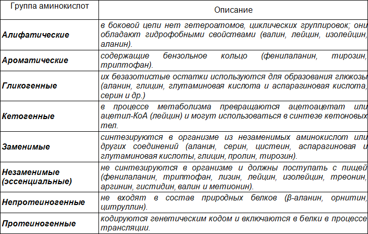 Аминокислоты, кодируемые генетическим кодом и включающиеся в процессе трансляции в белки человека, называют протеиногенными. Таких аминокислот 20, часть из них может синтезироваться в организме человека (заменимые аминокислоты), а часть поступает с пищей (незаменимые аминокислоты).