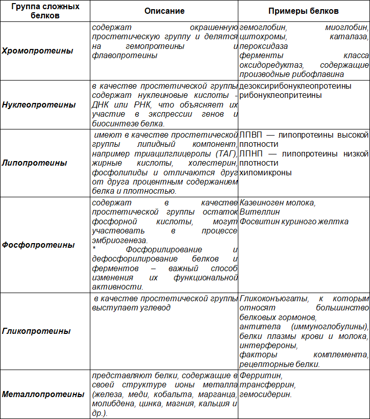 Белки условно подразделяют на простые (при гидролизе образуют смесь аминокислот) и сложные, или конъюгированные (состоят из белкового и небелкового компонентов). В качестве небелковой части (простетической группы) сложных белков могут выступать различные химические соединения, что находит отражение в классификации данной группы биологических соединений.