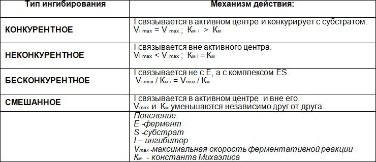 Конкурентное ингибирование – подавление скорости ферментативной реакции веществами, структурно сходными с субстратом. В этом случае, ингибитор связывается с активным центром фермента и вытесняется из него при повышении количества вступающего в реакцию субстрата; ингибирование характеризуется увеличением константы Михаэлиса (КM) без изменения максимальной скорости реакции (Vmax).