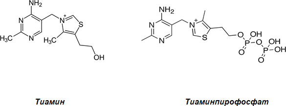 Рис. 6. Тиамин и его кофермент тиаминпирофосфат, синоним тиаминдифосфат (ТПФ, ТДФ)