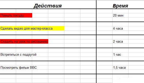 Внизу приведены примеры графика на день, желтым отмечено важное дело, которое нужно выполнить обязательно. Красным менее важные, и не отмеченные дела, которые можно отложить на потом. Как вы можете заметить, емкие дела разбиты, на более дробные части в отдельной таблице для удобства. Таким образом можно, контролировать любые процессы и задачи.