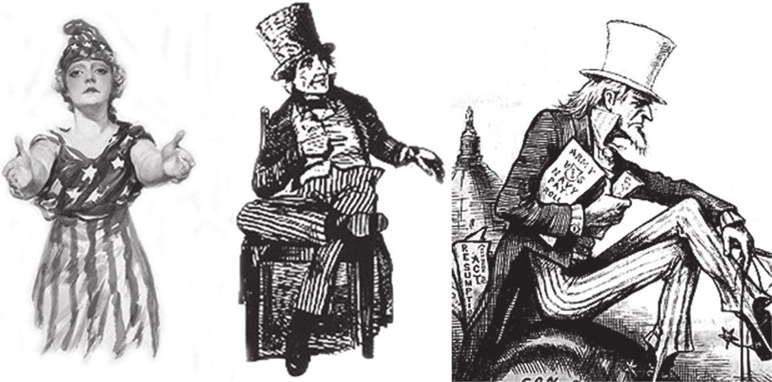 Также довольно популярным был образ Колумбии или леди Свободы, олицетворявший Соединенные Штаты после Войны за независимость. Она всегда изображалась во фригийском колпаке с государственной символикой США: флаг и герб, звезды и полосы, орел и т.д.19