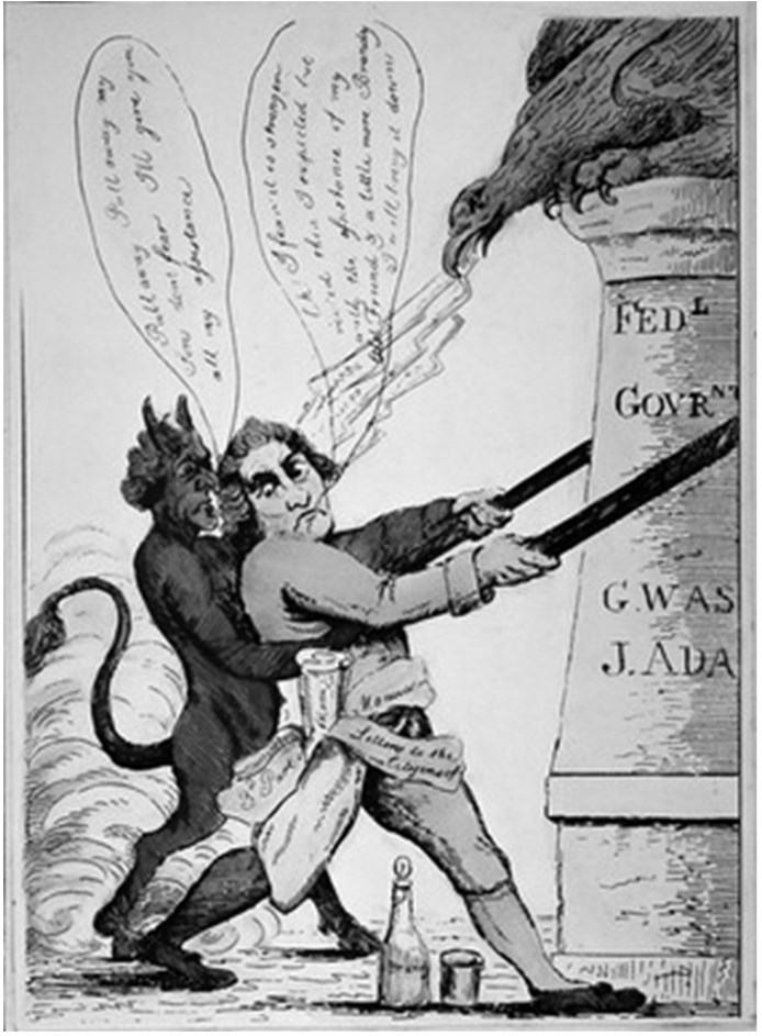 Карикатуристы напомнили в очень резкой форме в период избирательной кампании, что в свое время Джефферсон выступал против администраций Вашингтона и Адамса, написав известные Кентуккийские резолюции 1798 г., одобрявшие нуллификацию, т.е. отмену федеральных законов отдельными штатами. На карикатуре неизвестного автора Джефферсон вместе с дьяволом пытается опрокинуть колонну с надписью: «федеральное правительство».