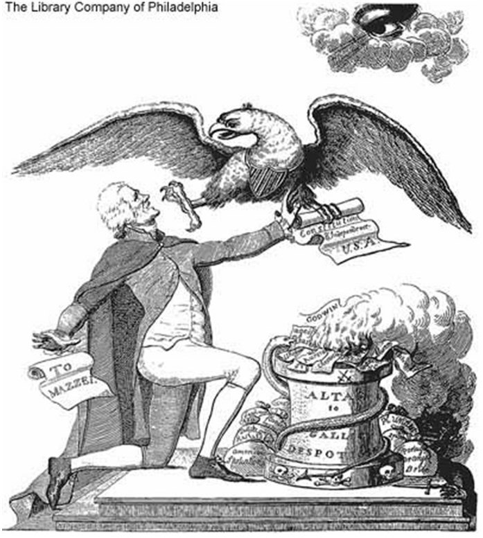 Не случайно, одна из карикатур «Провиденциальное открытие»43, авторство которой не установлено, критиковала именно профранцузские симпатии Джефферсона. На данной карикатуре он стоит коленопреклоненным перед подобием «алтаря галльского деспотизма», на котором сжигаются федералистские документы. Из его правой руки выпадают написанные им письма, компрометирующие Адамса и Вашингтона. Левой рукой президент пытается удержать Конституцию, которую тоже готов бросить в огонь. Но этот документу него вырывает американский орел под строгим взглядом Верховного существа44. Из-за «алтаря» выглядывает дьявол в образе змеи, пересчитывающий мешки с иностранным золотом.