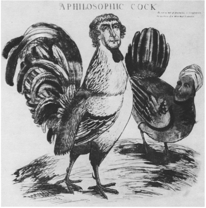 Но именно эта связь служила почвой для злых карикатур. На карикатуре Дж. Эйкина «Философский петух»46 Джефферсон изображен в виде петуха с человеческой головой с портретным сходством, а Салли в виде курочки (также с человеческой головой), любовно взирающей на петуха.