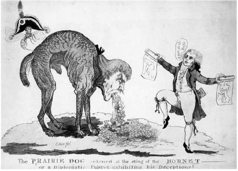 На этой карикатуре Джефферсон был представлен в виде дикой собаки с человеческой головой, отхаркивающей золотые монеты. Его кусает сзади шершень в наполеоновской треуголке. Здесь был намек на переговоры с Францией о покупке Луизианы. Кроме этой территории Джефферсон хотел приобрести еще и западную Флориду и запрашивал у Конгресса 2 млн долларов на эту цель.