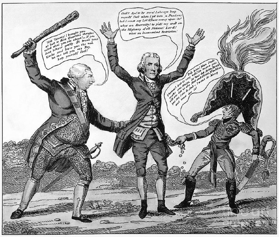 Президент изображен в позе подвергшегося нападению разбойников с поднятыми руками. На него нападают легко узнаваемые персонажи: английский монарх Георг III с дубинкой в руках и Наполеон Бонапарт, с саблей наголо. Последний вытрясает из кармана Джефферсона золотые монеты. Джефферсон говорит: «Круто? Да! Чтобы быть уверенным! Я всегда сохраняю хладнокровие, когда впадаю в ярость; но я должен сказать: “Господь! Помилуй нас! Какая чудовищность! Стягивать мое пальто на большой дороге всеми нациями! Господи, какое неудобное положение”».