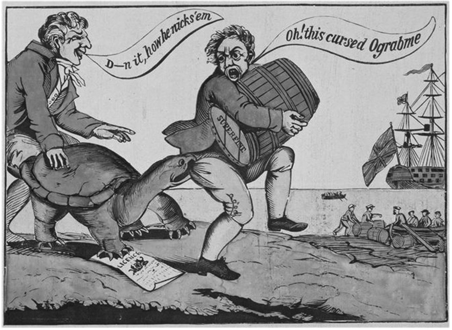 Огромная черепаха–эмбарго блокирует многие корабли своей гигантской массой… Она хватает за штаны торговца с бочонком, предназначенным для запрещенной торговли с британцами, который восклицает в сердцах: «О! Эта проклятая черепаха». Держащий черепаху джефферсоновец предупреждает: «Сделаешь это, и узнаешь, как она может кусаться». Смысл карикатуры в том, что черепаха – это намек на ненавистный закон Джефферсона об эмбарго. Название черепахи «Ograbme» – это слово «эмбарго», написанное задом наперед.