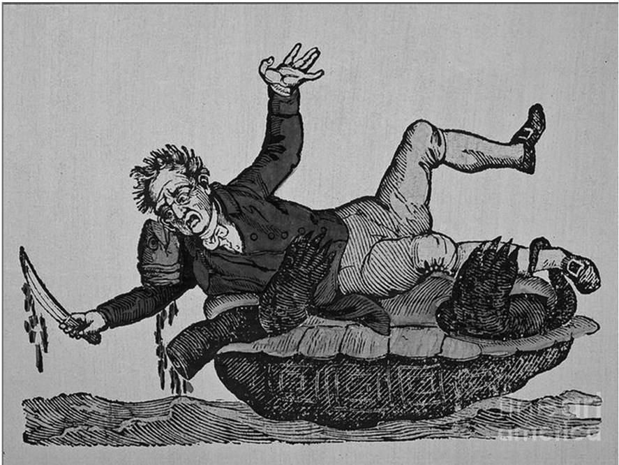Отрицательное отношение к политике эмбарго было выражено и в других карикатурах. «Ограбме51, или американская кусающаяся Черепаха» (1807)52 была создана художником Александром Андерсоном (1775–1870).
