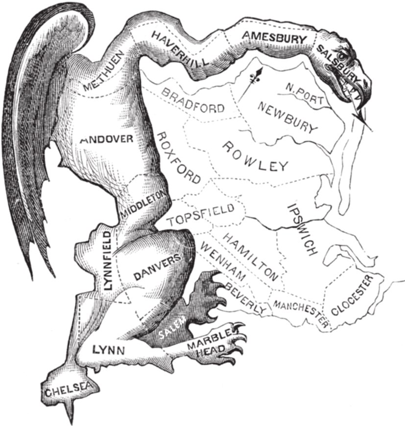 Карикатурист Э. Тисдейл изобразил карту новых округов графства Эссекс (Массачусетс), которую охватывала гротескная саламандра с отвратительной головой, из пасти которой высовывался раздвоенный язык. Эту мифическое изображение он назвал «джерри-мандер», обыграв фамилию губернатора и название саламандры57. Это название закрепилось за самим приемом перекройки избирательных округов.
