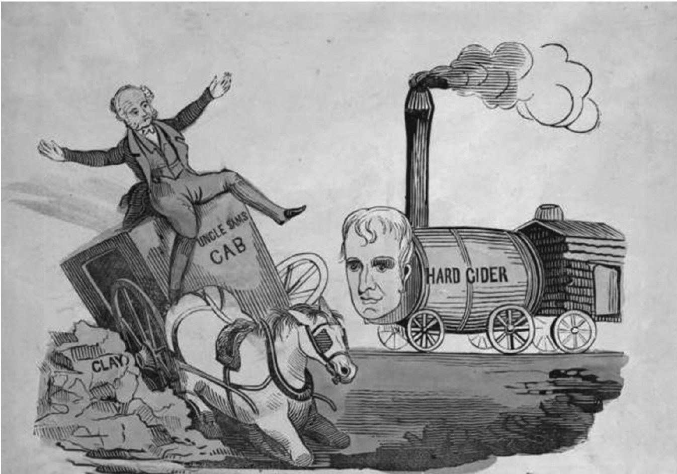 На одной из карикатур Роберта Итона «Народная линия. Будь внимателен к локомотиву»299 действующий президент Мартин Ван Бюрен изображен падающим с кареты «дядя Сэм», которая наткнулась на глиняную кучу с надписью «Клей». Рядом изображен Гаррисон, представленный как локомотив в виде бочки с сидром, с вагоном в виде бревенчатого дома. Локомотив уверенно движется к власти, в то время как карета, конечно, не может соперничать с промышленным прогрессом, за который ратовали виги.