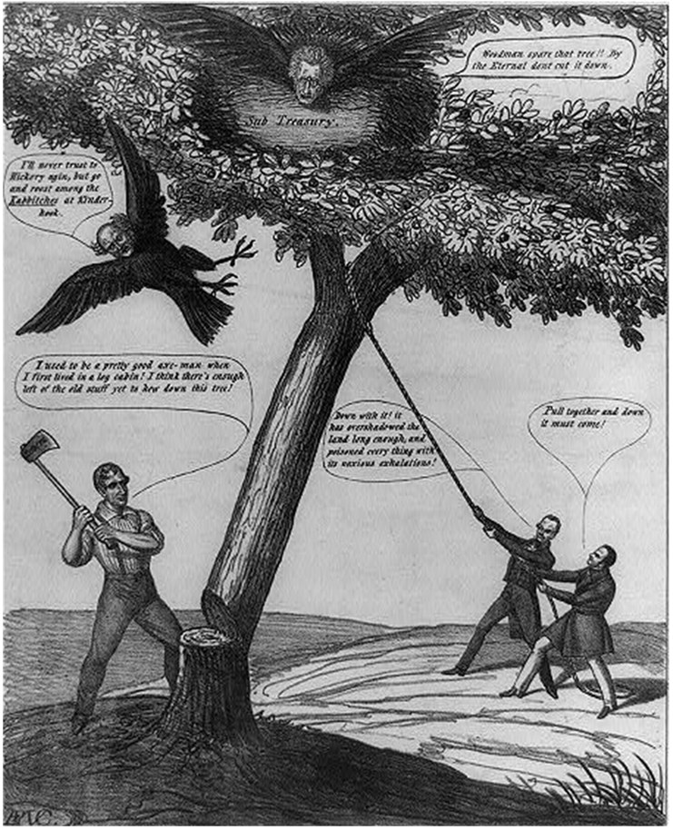 Художники-виги постоянно намекали на поддержку Ван Бюрена со стороны Джексона. Поэтому не случайно появляется карикатура Э. У. Клея «Срубить дерево Гикори и разрушить воронье гнездо»302.