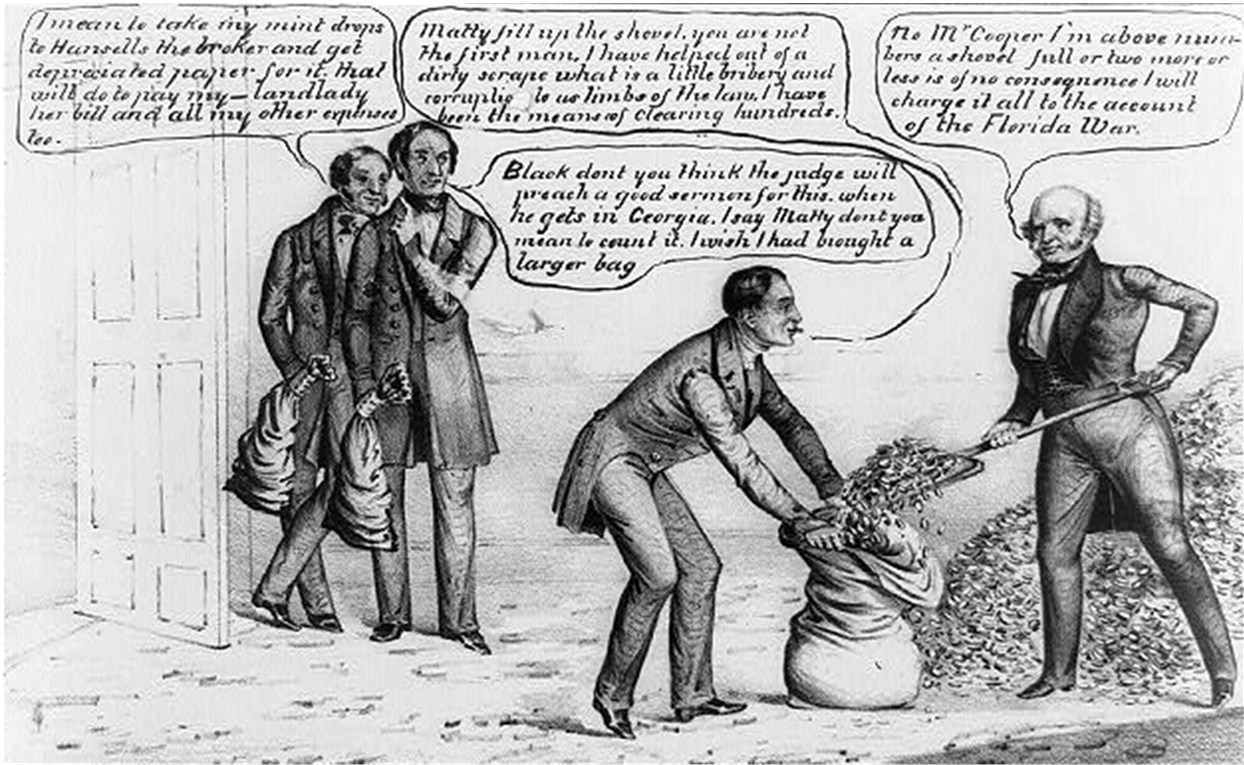 Оппозиционеры обвиняли Ван Бюрена в коррупции и узурпации власти, а также в финансовом кризисе. Это нашло отражение в печати. На одной из карикатур Генри Робинсона «Три Иуды» осуждаются мздоимство и коррупция в президентской администрации. Президент изображен, помещающим в мешок золотые монеты, которые он гребет лопатой из большой кучи305.