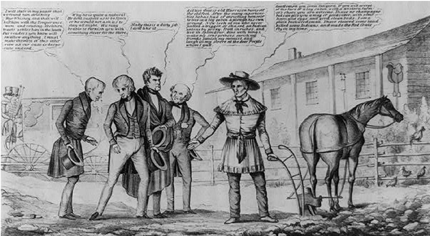 На карикатуре Генри Робинсона «Фермер из Норт Бенда и его визитеры» рядом с Гаррисоном изображены представители демократической партии Фрэнсис Блэр, Амос Кендалл, Джон Кэлхун и Мартин Ван Бюрен элегантно одетые, только что вышедшие из роскошной кареты с лакеями на запятках.