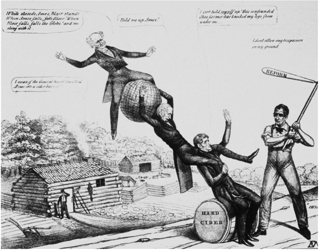 Он замахнулся на троицу демократов, находящихся в крайне неустойчивом положении, поскольку у них под ногами бочка крепкого сидра. Внизу пирамиды «политических жонглеров» почтмейстер Амос Кендалл, Он держит за ноги Френсиса Блэра, тот в свою очередь поддерживает поднятыми руками глобус311, на котором восседает Ван Бюрен. Но его неустойчивое положение непременно приведет к падению. На заднем плане, почесывая голову, наблюдает за всем этим цирком простой фермер-избиратель. Он стоит около бревенчатой хижины.