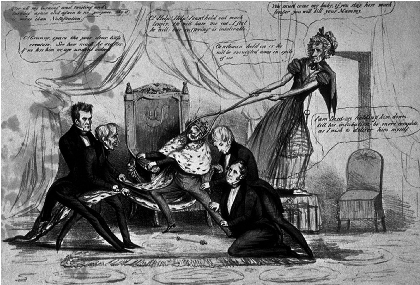 Гаррисон, одетый как женщина, пытается удалить Ван Бюрена с его трона с помощью щипцов акушерки. Ван Бюрен, в королевской мантии и в короне, вцепившись в пышно украшенный трон, говорит: «Помогите! Помогите! Я не могу продержаться дольше. Он вытащит меня, я чувствую, что вытащит: мои страдания невыносимы». Его удерживают сторонники: Джон Кэлхун, Фрэнсис Престон Блэр, Амос Кендалл и Томас Харт Бентон.