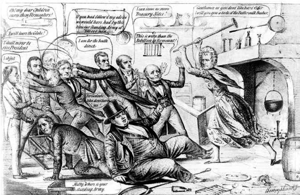 В домашней кухне Гаррисон, одетый как судомойка, замахивается мутовкой для сбивания пахты на бегущих демократов. Беглецы (слева направо, стоя): военный министр Джоэл Пойнсетт, генеральный почтмейстер Амос Кендалл, редактор вашингтонской газеты «Globe» Фрэнсис Престон Блэр (вытянув руки, смотрит налево), государственный секретарь Джон Форсайт, Джон Кэлхун, Леви Вудбери и Ван Бюрен. Томас Харт Бентон (слева) и представитель Алабамы Диксон Х. Льюис, сторонник прав штатов, упали на пол. Карикатура снабжалась интересными репликами персонажей. Гаррисон: «Джентльмены, поскольку вы не любите крепкий сидр, я дам вам попробовать пахту». Ван Бюрен: «Это хуже, чем мятеж в Вермонте!» Пойнсетт: «Если бы вы последовали моему совету, у нас была бы к этому времени наша постоянная армия в 200 000 человек». Блэр: «Я покину свой “Глобус!”» Форсайт: «Я никогда не буду вице-президентом». Кэлхун: «Я прямо на Юг». Вудбери: «Я больше не смогу выпускать казначейские векселя!»316 «Clar de Kitchen» – так называлась популярная танцевальная песня негритянского менестреля комика Т. Д. Райса.