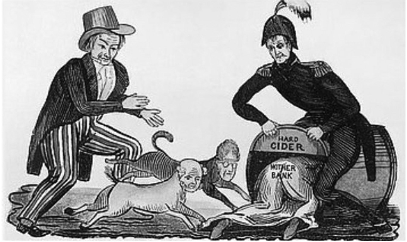 Одна из карикатур под названием «Ловушка захлопнулась. Киндерхукская лиса поймана»304 рассказывает о попытках Эндрю Джексона освободить Ван Бюрена с помощью рычага. Ван Бюрен заперт в хижине с зарешеченным окном. Печная труба заткнута, разумеется, ничем иным, как бочкой с сидром.