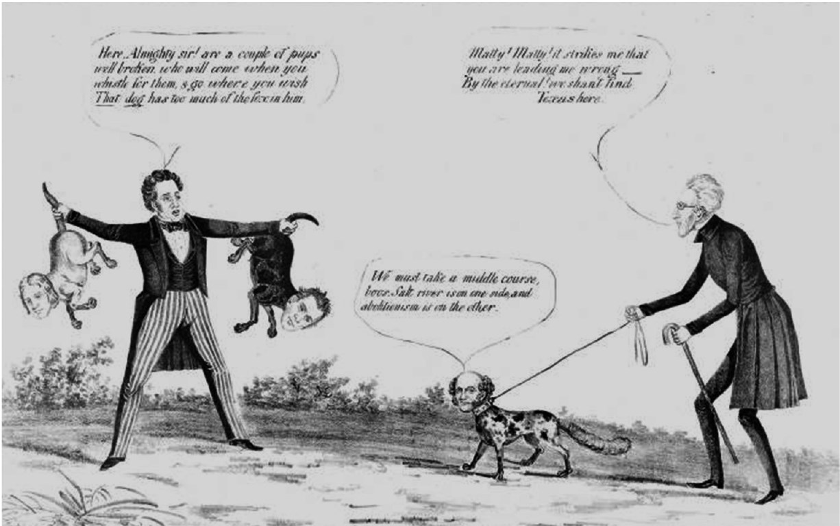 Ища средний курс между вопросами аннексии Техаса, с одной стороны, и проблемой рабства в территориях, с другой, Ван Бюрен потерял поддержку южных демократов, включая экс-президента Эндрю Джексона. На карикатуре художник изображает Ван Бюрена в виде собаки с пушистым лисьим хвостом, сбивающей с пути своего хозяина (Джексона). Джексон говорит: «Мэтти! Мэтти! Мне кажется, что ты ведешь меня неправильно! Мы не найдем здесь Техас». «Мы должны выбрать средний курс, босс», – настаивает Ван Бюрен. – Солт-Ривер, с одной стороны, и, аболиционизм, с другой». Слева от них брат Джонатан326 в полосатых штанах держит за хвосты двух собак с головами Джеймса Полка и Джорджа Далласа. Он говорит Джексону: «Вот, всемогущий сэр! Пара щенков, хорошо натасканных, которые прибегут по вашему свистку, и направятся туда, куда вы захотите. В “этой вашей собаке” слишком много лисицы»327.