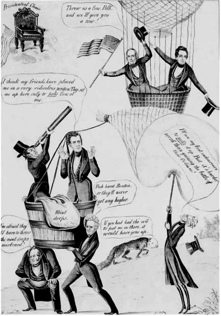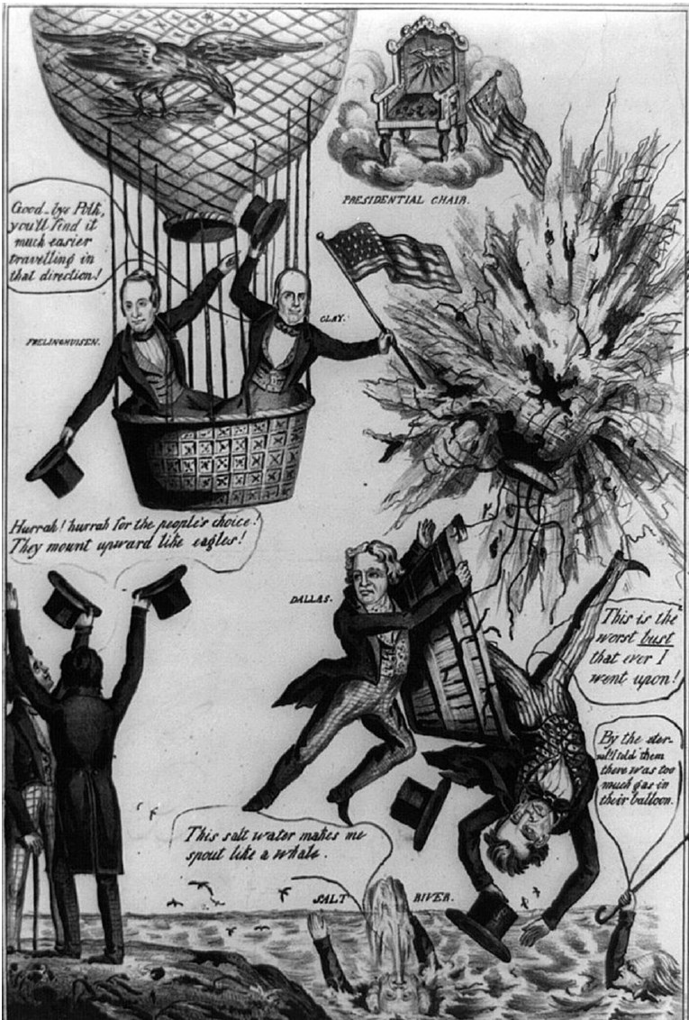 Надежды вигов на победу отразила карикатура Джеймса Бейли «Восхождение на воздушном шаре к президентскому креслу»331. Отражая предвыборную уверенность вигов в кампании 1844 г., художник изображает господство этой партии над демократами в гонке за президентское кресло. Виги поднимаются на своем шаре легко; Клей машет флагом, а Фрелингхейзен указывает на «президентское кресло», которое появляется слева на облаке. Демократический воздушный шар не поднимается из-за отсутствия газа и подталкивается тростью Эндрю Джексоном. Джексон говорит: «Я приложу все усилия, чтобы подтолкнуть Полка. Но это тяжелее, чем выиграть битву за Новый Орлеан!»