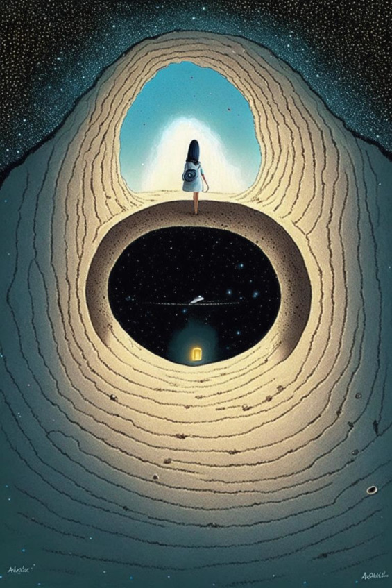 …Вот он смотрит на себя, сидящего внизу, и уже со стороны видит летящее растянутое облако вверх. Промелькнув около астероида, застыв на мгновение и не в состоянии что-то изменить, панически устремляется за тонкими нитями времени к червоточине. Уменьшаясь в размерах, маленький квант среди таких же миллиардов светящихся точек потока двигался в немоту пространственного временного континуума Млечного пути.