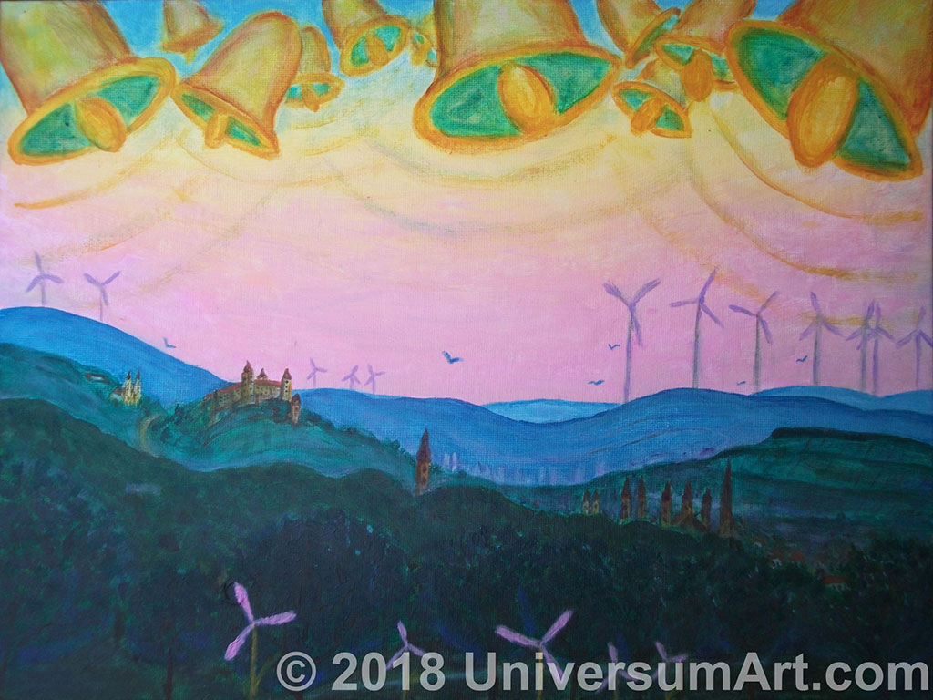 Меж холмами – петляньем дорог и рек —Принимает земля – к небу робкий взбег:Обнимает поля – первый солнца смех…По откосам, склонам – дар вбирает щедрей —Сетью ветряков и солнечных батарей,Песней лепестков исполнившись всё пестрей…А в лесах деревья распрямляются в рост,Сплошь увешаны мотками галактик-гнёзд:Тайны режутся, рождаясь птенцами звёзд… —Что высиживать готовы яйца планет —В солнц любви, клубящейся в туманностей цвет:К новой Жизни, чей дрожит на ветвях рассвет.03.04.2018 г. (Вюрцбург)«Долгий колокола звон…»