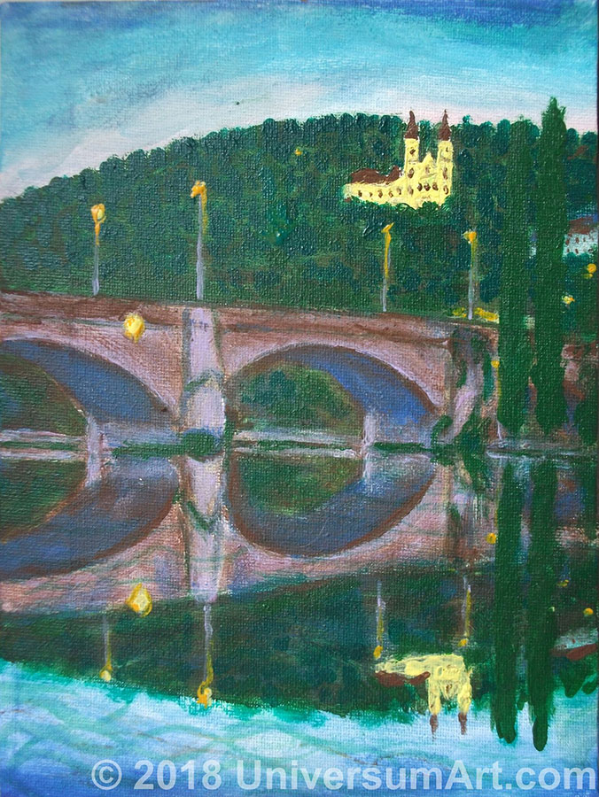 Та мельница возле старого моста —Одна из семи домов на всём берегу,Каким-то чудом переживших войну:Пределом, за которым – лишь пустота, —Сознаньем, отключавшимся на бегу! —Усильем смутным – верно кружит волну…Что б тут за столетья ни происходило —Она колесо, как прежде, крутила:Менялись власти, страсти, напасти…Она ж – на счастье или несчастье? —Внимая реке, всё так же вертелась —Хотелось то ей или не хотелось…Когда стоял город в руинахИ даже сам мост был взорван,Она ж – непокорно? Невинно? —В рыданьях – опорой глубинной —Тянула свой жребий упорно:Из вод – пряжу судеб пряла……И вот – как-то пережила.Теперь – продают здесь своё вино,На крепость и берег прекрасен вид…А ей – в снов дремучести – всё равно,И вряд ли уж что-то её удивит!Пусть пары с бокалами по мостуГуляют, любуясь на Красоту,А в гулких пролётах шумит вода:Явь – перемолола пути, года!Там вращается колесо —И пока прощается всё.17.04.2018 г. (Вюрцбург)«Закат стекает…»